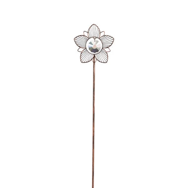 Add a sparkling flower stake to your plants indoor or outdoors. This copper tone stake holds a metal shaped flower wit 5 petals and a large center crystal. It is an elegant décor.