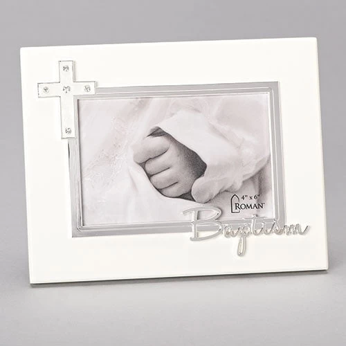 Commemorate this important occasion. This beautiful baptism frame features white wood and silver decals. An ivory enamel cross adorns the side and the sentiment “Baptism” is scripted towards the bottom. It is so simple yet so elegant. Holds a 4″x6″ photo. Made with lead free zinc alloy. 7″H