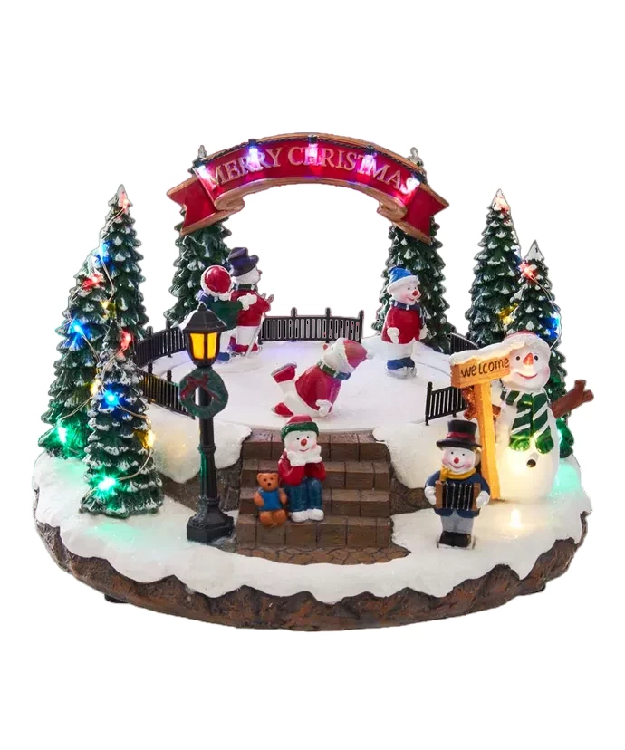 This LED light-up musical “Merry Christmas” snowmen ice rink table piece is a fun and festive addition to your home or holiday décor. It features a snow covered ice rink surrounded by snowy Christmas trees that light up and a light-up street light. When switched on, the snowman skate and “Jingle Bells” plays.
