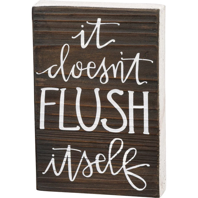 A wooden block sign featuring a hand lettered “It Doesn’t Flush Itself” sentiment. Features white text against a dark wood finish and white-washed sides. Easy to hang via predrilled back keyhole or can free-stand alone.