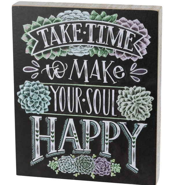 A chalk art box sign lending a hand lettered “Take Time To Make Your Soul Happy” sentiment with succulent designs. Great for gifting and is easy to hang as a gallery wall accent or can free-stand alone.