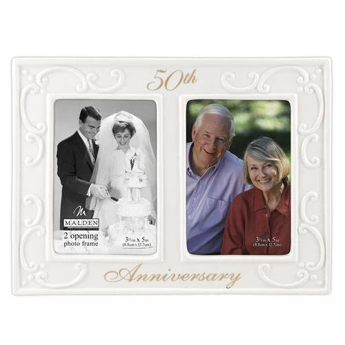 Celebrate a special golden anniversary with this “Then and Now” photo frame. This dimensional ceramic frame has scroll accents.