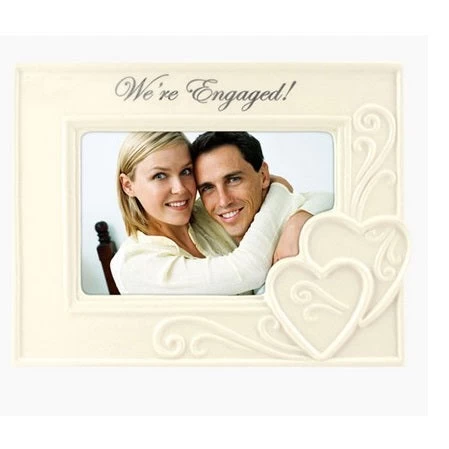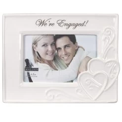 This ceramic tabletop frame is the perfect way to display a favorite 4″ x 6″ engagement photo. It features raised heart decorations, as well as the silver foil sentiment, “We’re engaged!” above the photo.