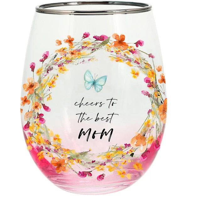 Meadows Of Joy Butterfly Floral 20 Oz. Stemless Wine Glass Cheers To The Best Mom