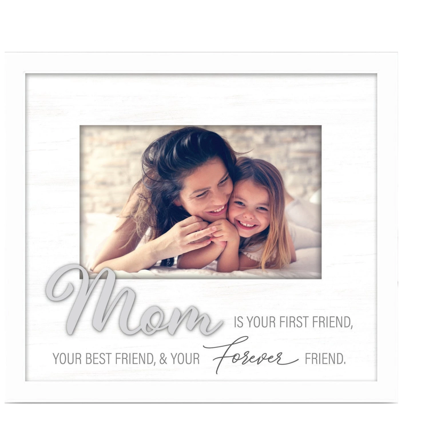 Celebrate your Mom with this beautiful wood frame. This decorative frame features a scripted “Mom” word attachment and the sentiment ‘Mom is your first friend, your best friend, & your forever friend.’