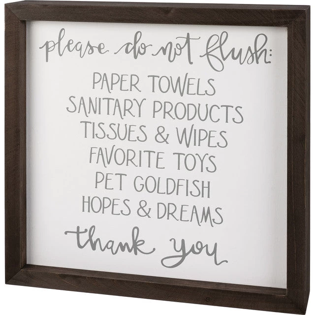 A wooden inset box sign featuring hand lettered “Please Do Not Flush: Paper Towels – Sanitary Products – Tissues & Wipes – Favorite Toys – Pet Goldfish – Homes & Dreams – Thank You” sentiment on a white base. Features dark stained sides to enhance the design. Easy to hang or can free-stand alone.