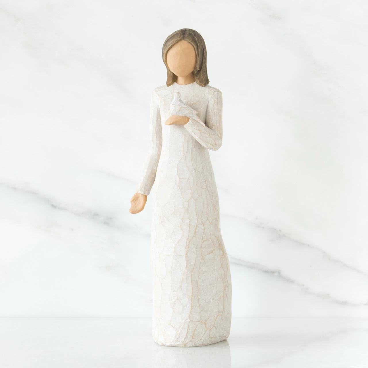 This iconic figure of peace and serenity is a tangible reminder of healing, comfort, hopefulness and remembrance in times of sorrow. “Her gesture is one of openness and reflection; the white dove embodies inner beauty and peace.” –Susan Lordi