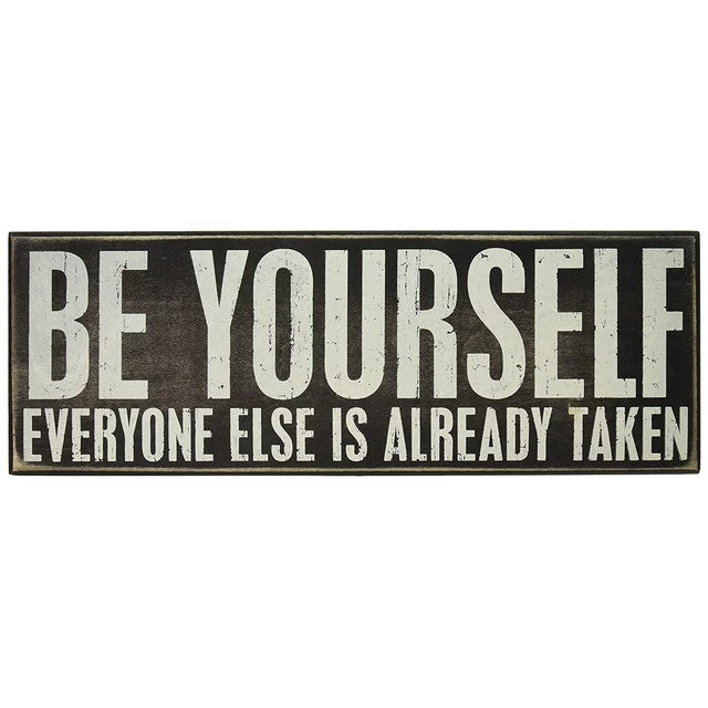 A classic black and white wooden box sign featuring a distressed “Be Yourself Everyone Else is Already Taken” sentiment. Easy to hang or can free-stand alone.