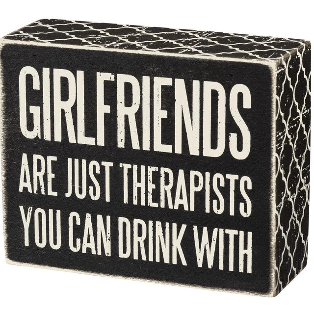 A classic black and white wooden box sign featuring a distressed “Girlfriends Are Just Therapists You Can Drink With” sentiment with tile print trim designs. Easy to hang or can free-stand alone.