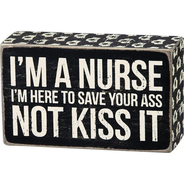 The World Health Organization has designated 2020 the Year of the Nurse and the Midwife. Join us in celebrating these beloved healthcare workers with this classic black and white wooden box sign featuring a distressed “I’m A Nurse – I’m here To Save Your Ass Not Kiss It” sentiment with nurse cap print trim designs. Easy to hang or can free-stand alone.
