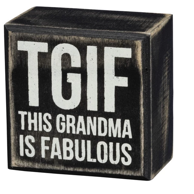A classic black and white wooden box sign featuring a distressed “TGIF – This Grandma Is Fabulous” sentiment. Easy to hang or can free-stand alone.