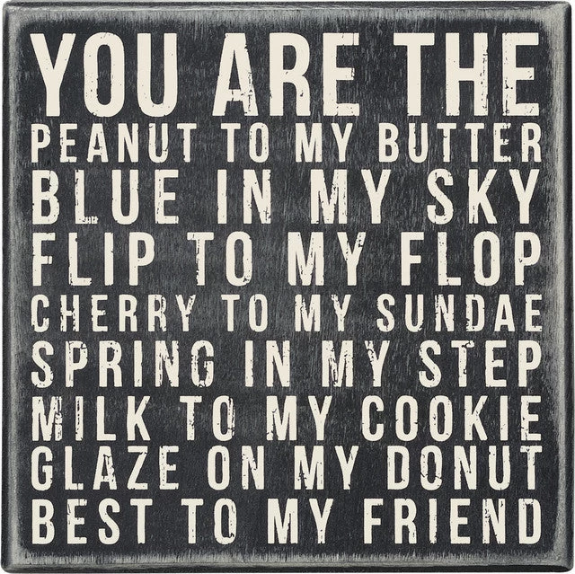 A classic black and white wooden box sign featuring a distressed “You Are The Peanut To My Butter – Blue In My Sky – Flip To My Flop – Cherry To My Sundae – Spring In My Step – Milk To My Cookie – Glaze To My Donut – Best To My Friend” sentiment. Easy to hang or can free-stand alone.